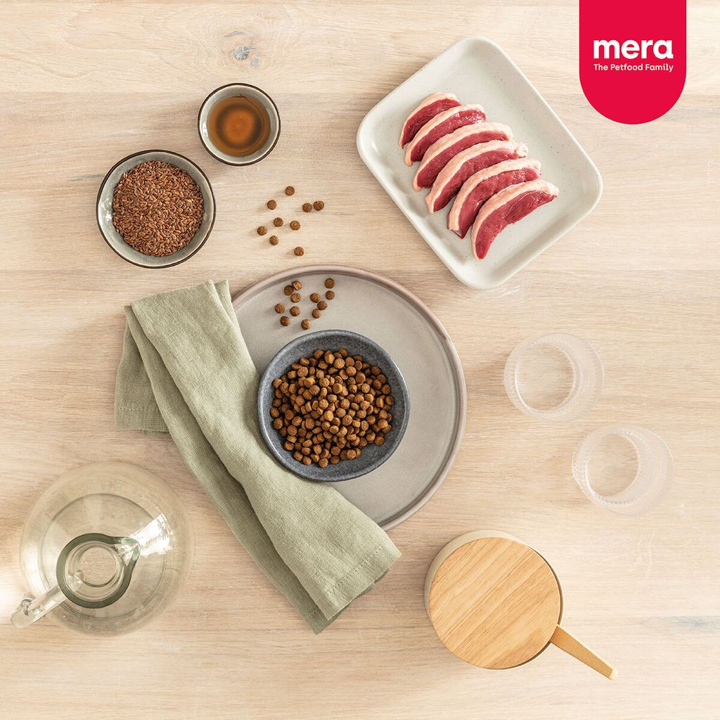 • Chicken protein (dried, incl. 20% from "Initiative Tierwohl" farms), fresh duck meat (14%), potato flakes, peas, poultry fat, lignocellulose, potato starch, poultry protein hydrolysate, dried egg, beet pulp dried, linseed, potato protein, salmon oil, sunflower oil, minerals, colostrum (0.5%), chicory inulin, yeast cell walls (0.2 %, rich in mannan oligosaccharides and beta-glucans).